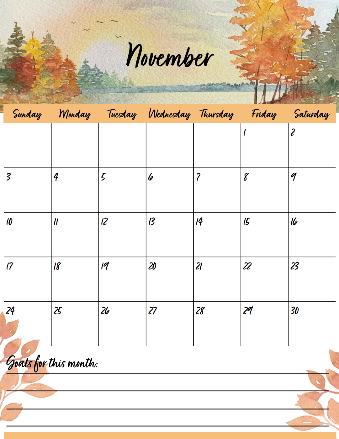 Transform your month with our stunning November calendar featuring a beautifully crafted watercolour painting of a vibrant fall landscape. This delightful design not only adds a splash of autumn charm to your space but also keeps you organised and inspired!